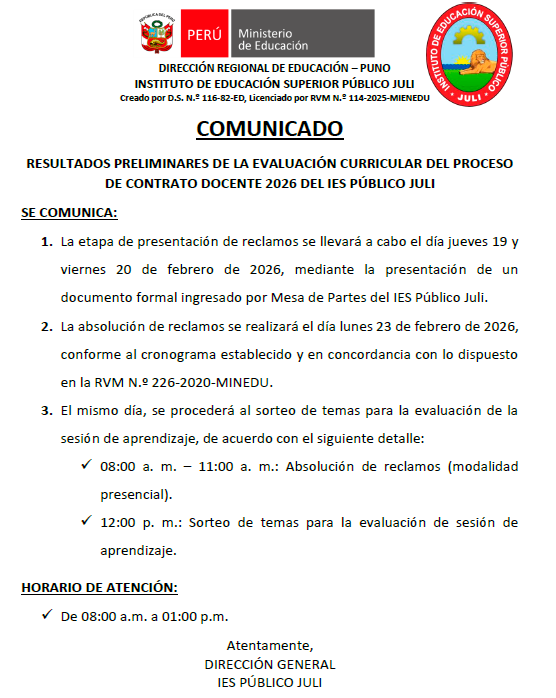 RESULTADOS PRELIMINARES DE LA EVALUACIÓN CURRICULAR DEL PROCESO DE CONTRATO DOCENTE 2026 DEL IES PÚBLICO JULI