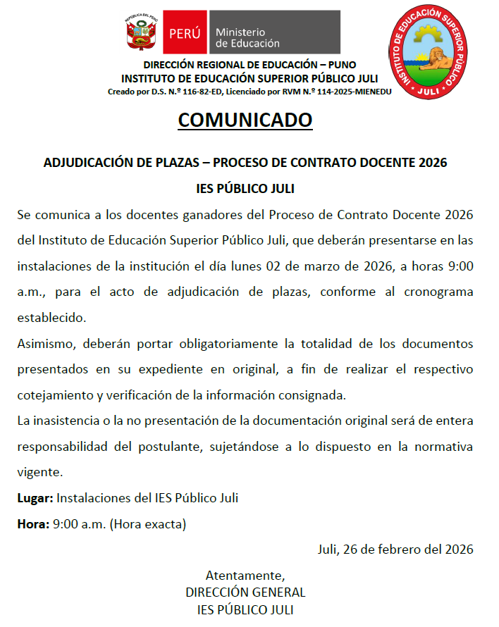 RESULTADOS FINALES DEL PROCESO DE CONTRATO DOCENTE 2026 DEL IES PÚBLICO JULI